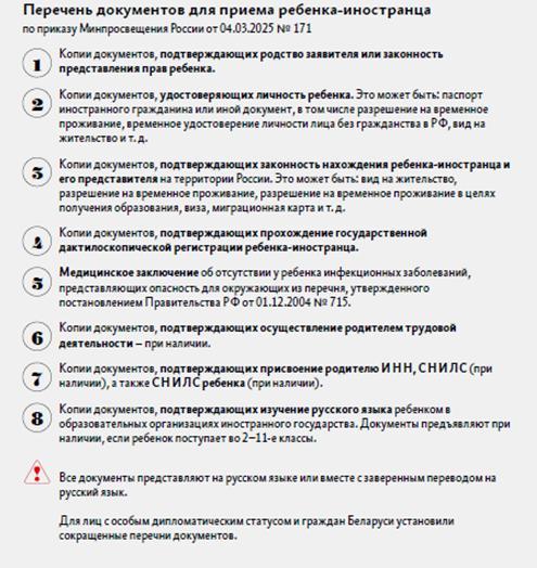 Для приема родитель(и) (законный(ые) представитель(и) ребенка, являющегося иностранным гражданином или лицом без гражданства, или поступающий, являющийся иностранным гражданином или лицом без гражданства, предъявляет (предъявляют) в соответствии с изменениями внесенными в Порядок приема на обучение по образовательным программам начального общего, основного общего и среднего общего образования, утвержденный приказом Министерства просвещения Российской Федерации от 02 сентября 2020 г. №458: